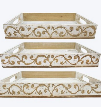 Elevate your space with our whitewashed carved tray, featuring intricate details and versatile charm. Ideal for displaying or serving, it adds rustic elegance to any setting.